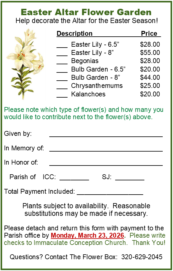 Please turn in Order Form and Payment to Church Office prior to Monday, March 23