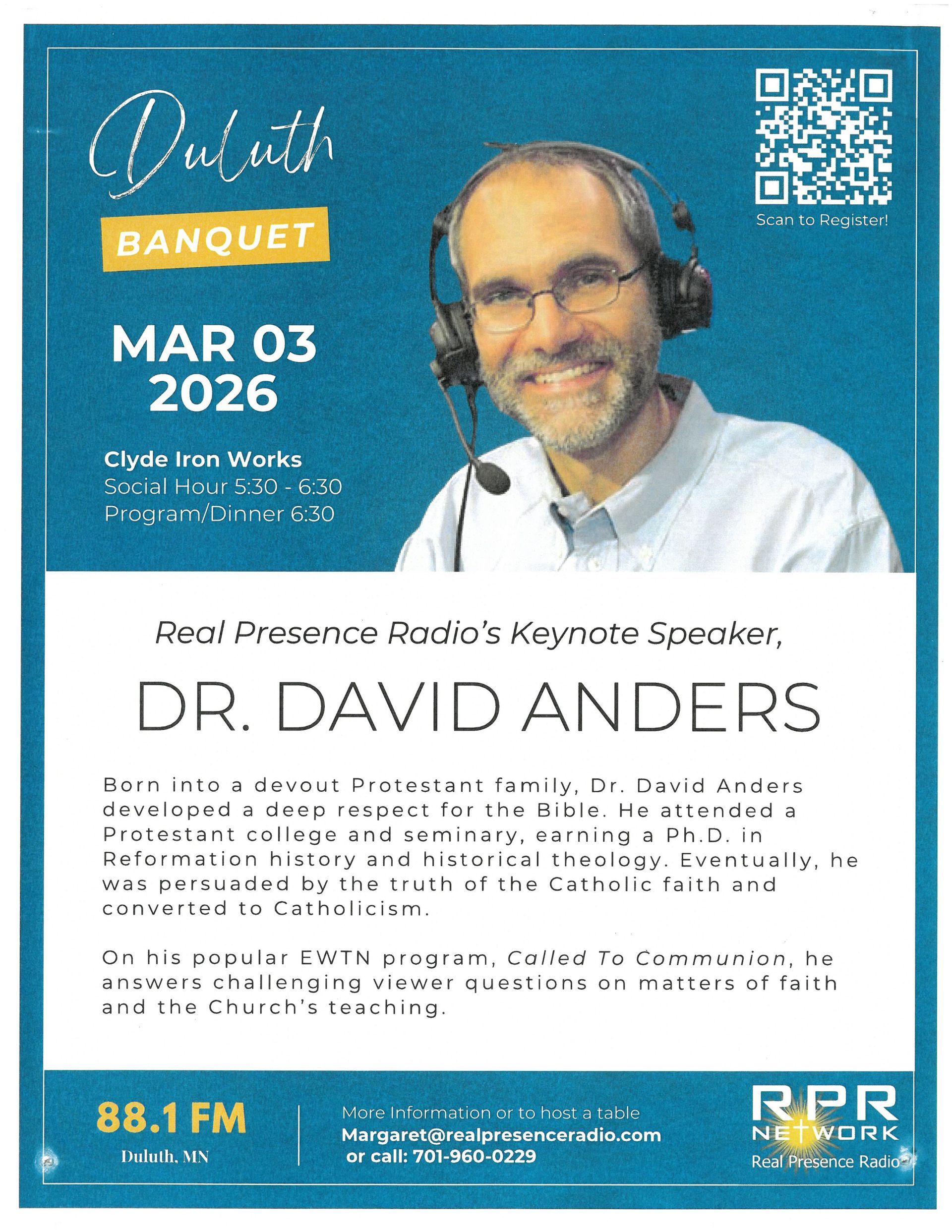 Real Presence Radio is hosting a Duluth banquet at Clyde Iron Works with Keynote Speaker, Dr. David Anders. Click on the Learn More button below for more details or to purchase your tickets.